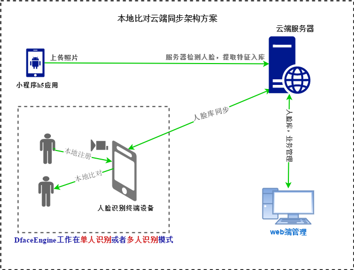 The local recognition device capture face picture, detects face, liveness detect, extracts face features, and uploads the feature byte array or face image to the cloud server for comparison.