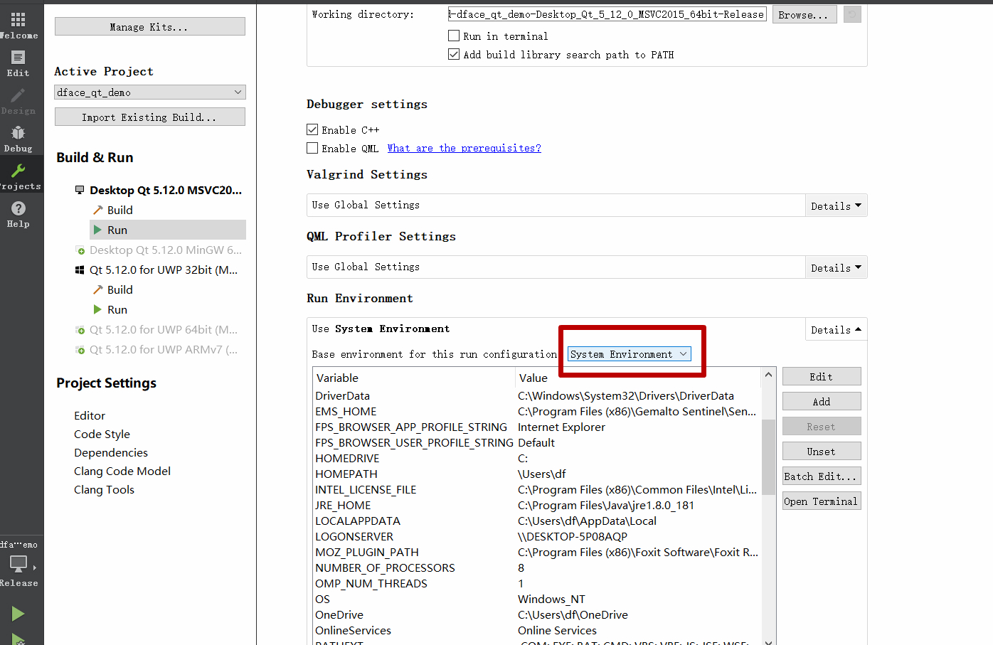 Click Projects->Run->Run Environment to switch to System Environment, see {sdk_path}/example/cpp/dface_qt_demo_setup.jpg for details