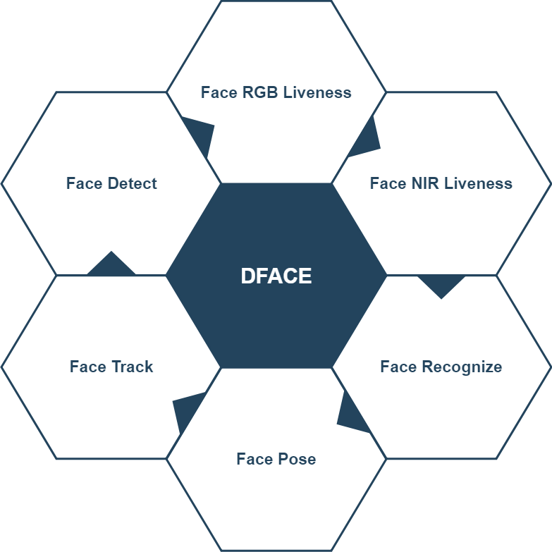 The following figure describes the basic framework of DFACE. It is mainly composed of 8 functional modules, and each module is responsible for a part of functions, such as face detection (DfaceDetect), feature extraction (DfaceRecognize), liveness detection (DfaceRGBLiveness), etc.